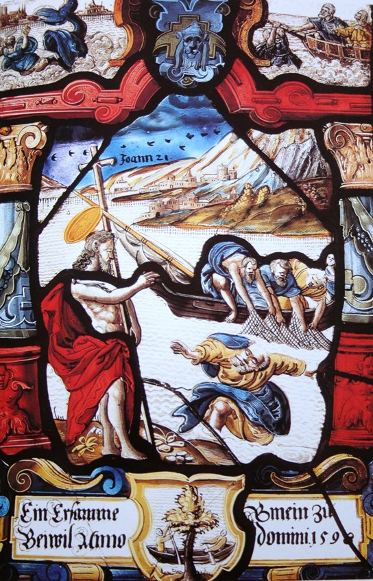 Das Bild hat den Fischzug Petri zum Inhalt. Zwei bunte Säulen, die durch einen Querbalken verbunden sind, umrahmen die prachtvolle Darstellung dieses Fischfanges mit dem Vermerk «Joann 21». Die beiden Oberbildchen zeigen die Geschichte von Jona. Rechts wird er von seinen Gefährten ins Meer gestossen, links sieht man ihn gerettet, nachdem er vom Fisch ans Lang gespien wurde. Eine breite Tafel am unteren Rand der Scheibe wird durch das damalige Beinwiler Gemeindewappen geteilt, wobei sich vor den beiden Fährmänner in ihrem Boot am Ufer im Vordergrund ein stattlicher Baum erhebt. Die Inschrift lautet: «Ein Ersamme Gmein Zu Beinwil Anno domini 1598
